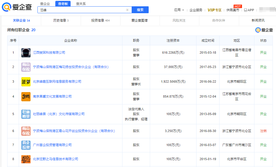 爱企查App显示,截至目前,汪峰名下共关联20家企业,其中12家为存续状态,包括江西斐耳科技有限公司、宁波梅山保税港区梅花扬世投资合伙企业(有限合伙)、北京峰趣互联网信息服务有限公司等,版图涉及文化传媒、信息技术、投资管理等领域。